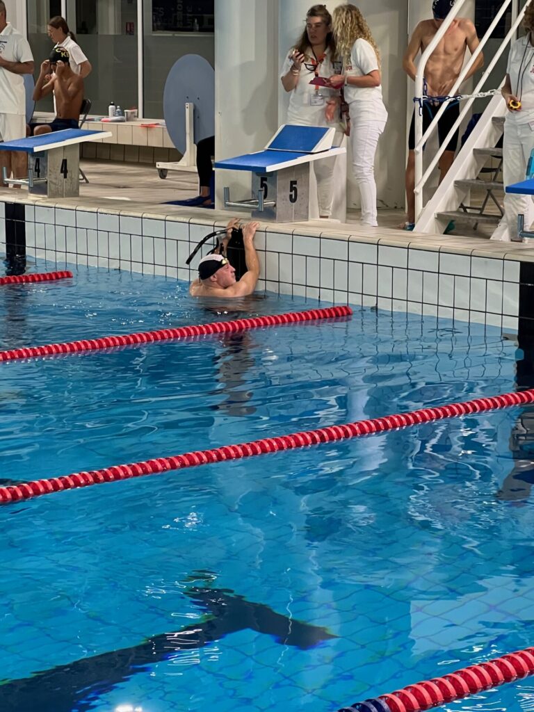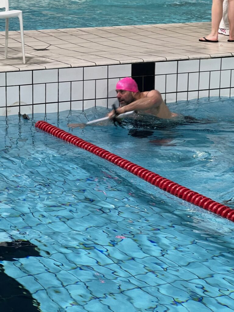 Thierry pressent qu’il est le premier dans sa catégorie d’âge au 400 m bipalme …