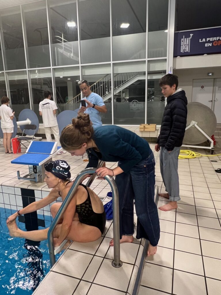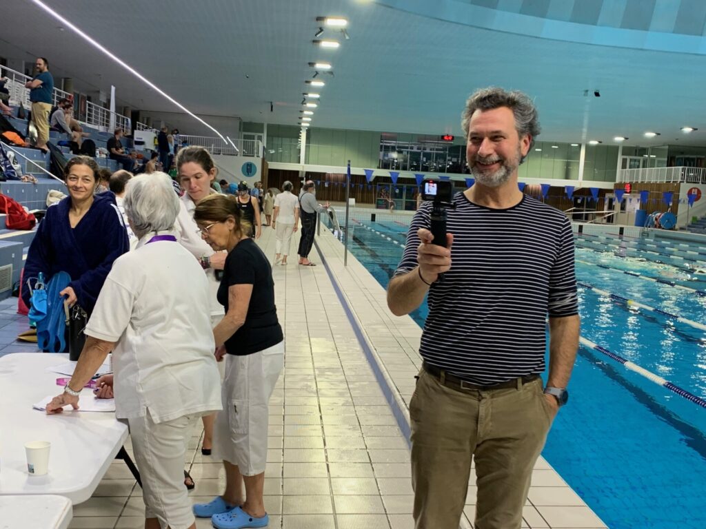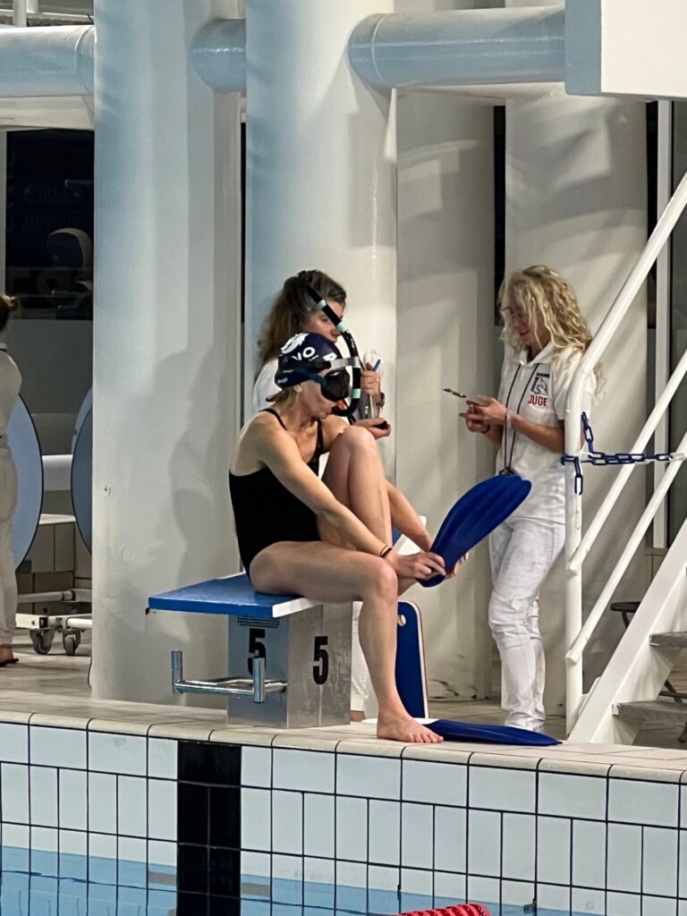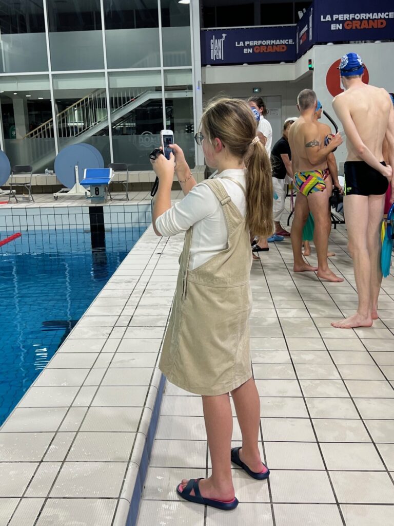 Olympe, la plus jeune nageuse de l’ASG-Palme, photographiant Franck qui prend le départ du 50 m bipalme …