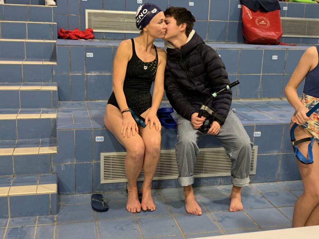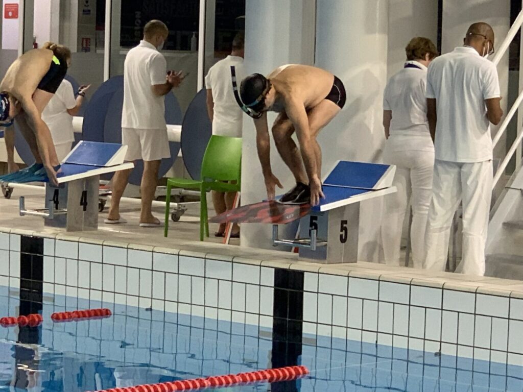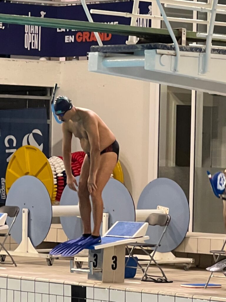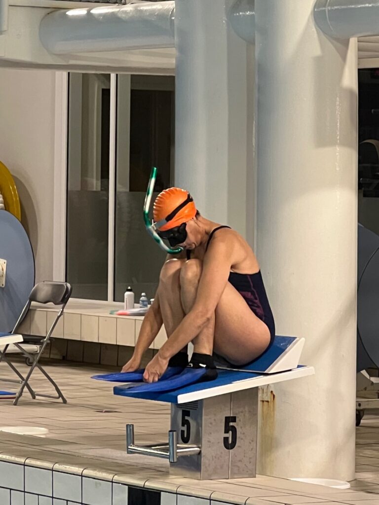Olympe, la plus jeune nageuse de l’ASG-Palme, photographiant Franck qui prend le départ du 50 m bipalme …