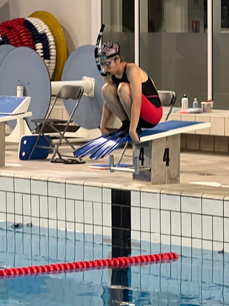 Maï prête pour sa première compétition d’apnée ; elle obtiendra une médaille !