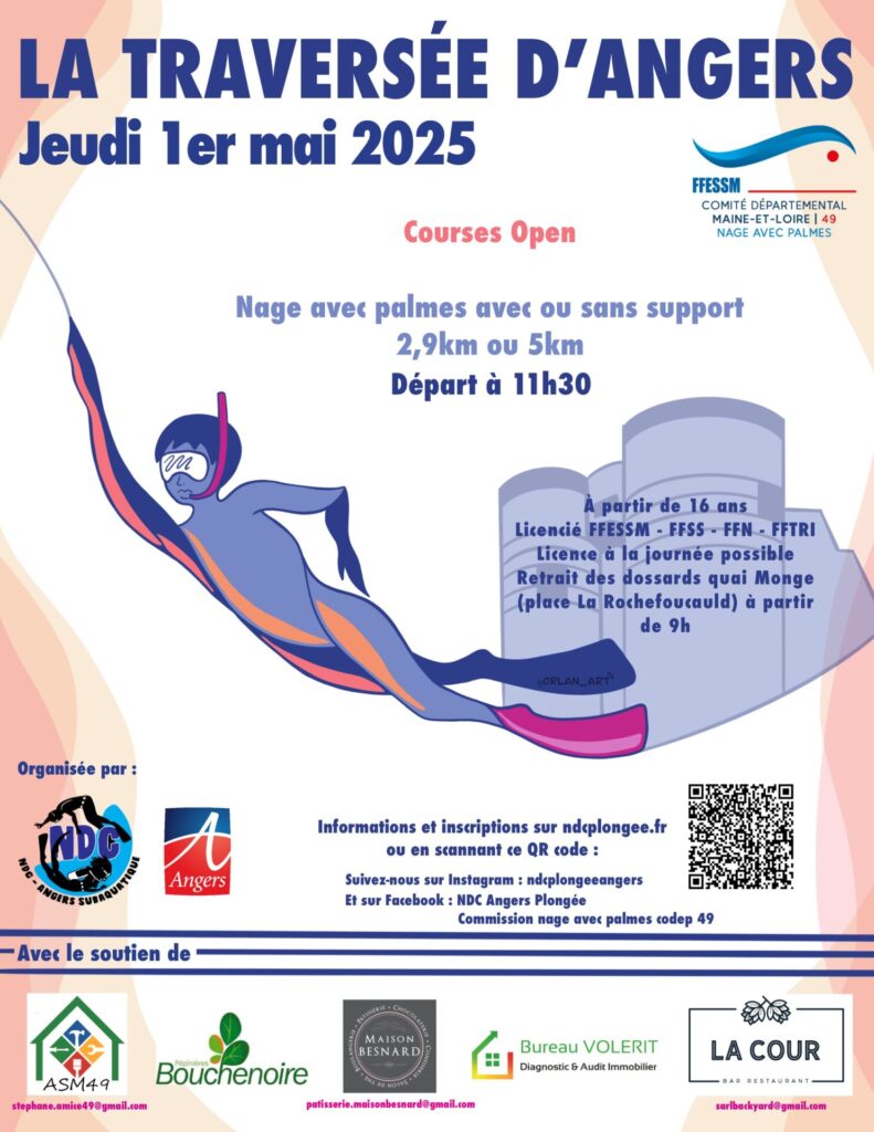 Cette Traversée d’Angers à la Nage a pour objectif de contribuer au développement et à la découverte de la Nage Avec Palmes en rassemblant compétiteurs et nageurs “loisirs” pour une descente de la Maine.