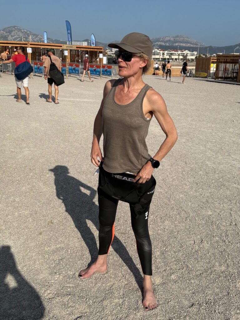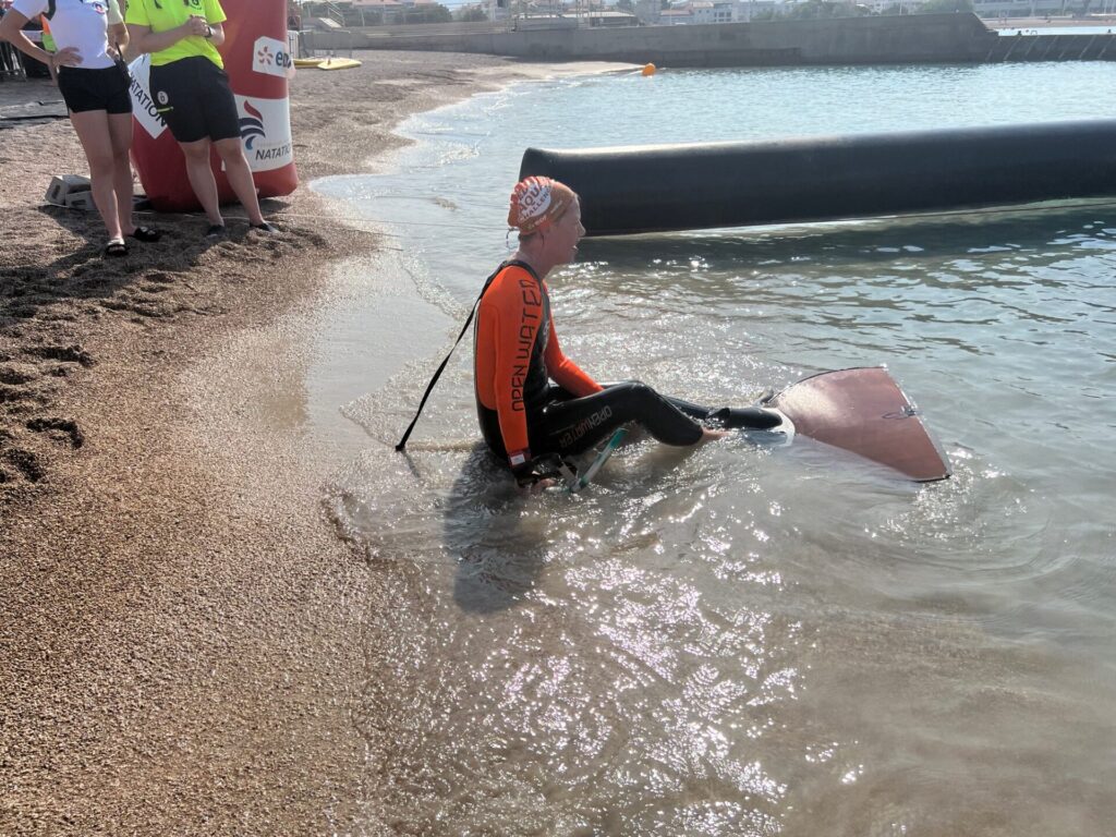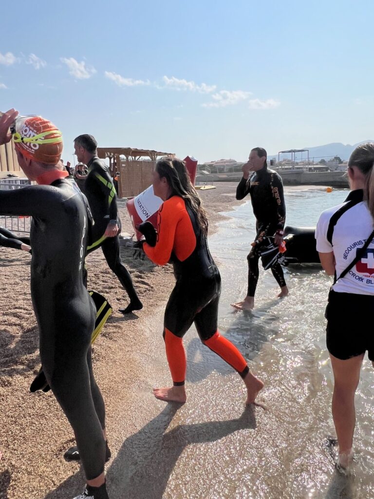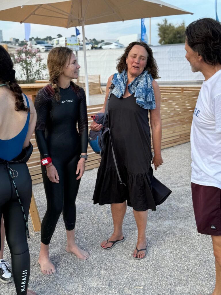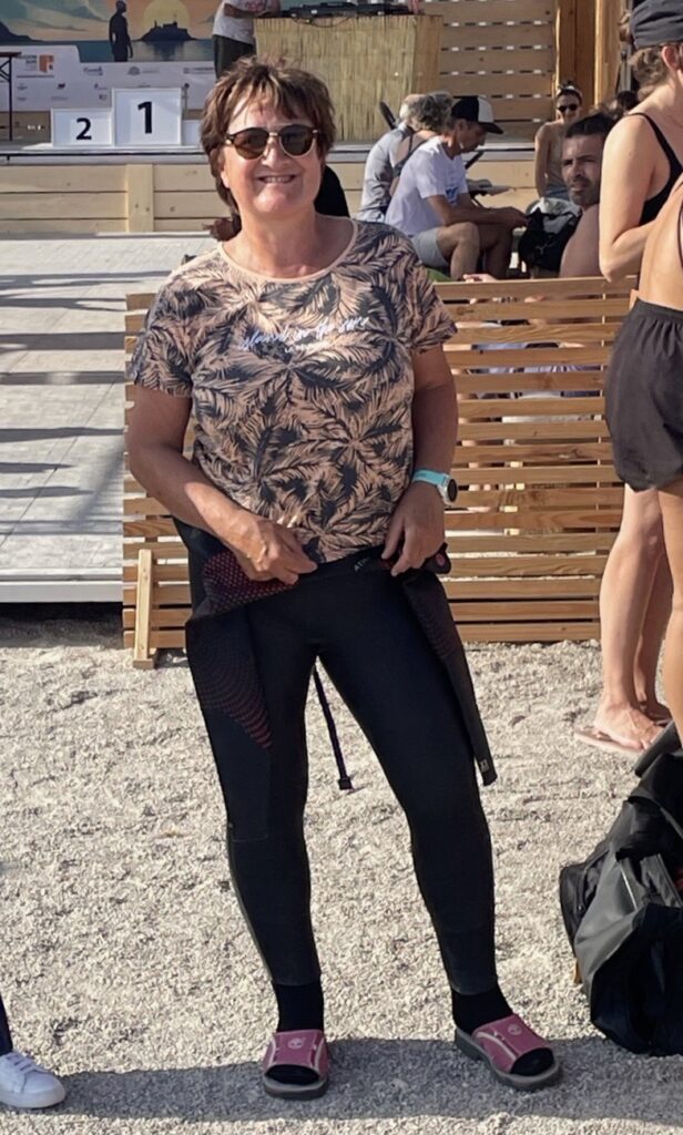 Non inscrite à cette épreuve, elle va prendre le départ et revenir sur la plage après 500 m de nage, tout cela, pour essayer son nouveau matériel …