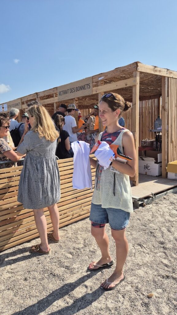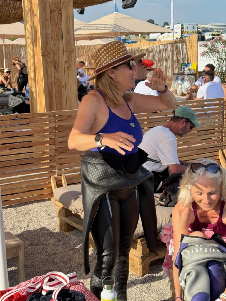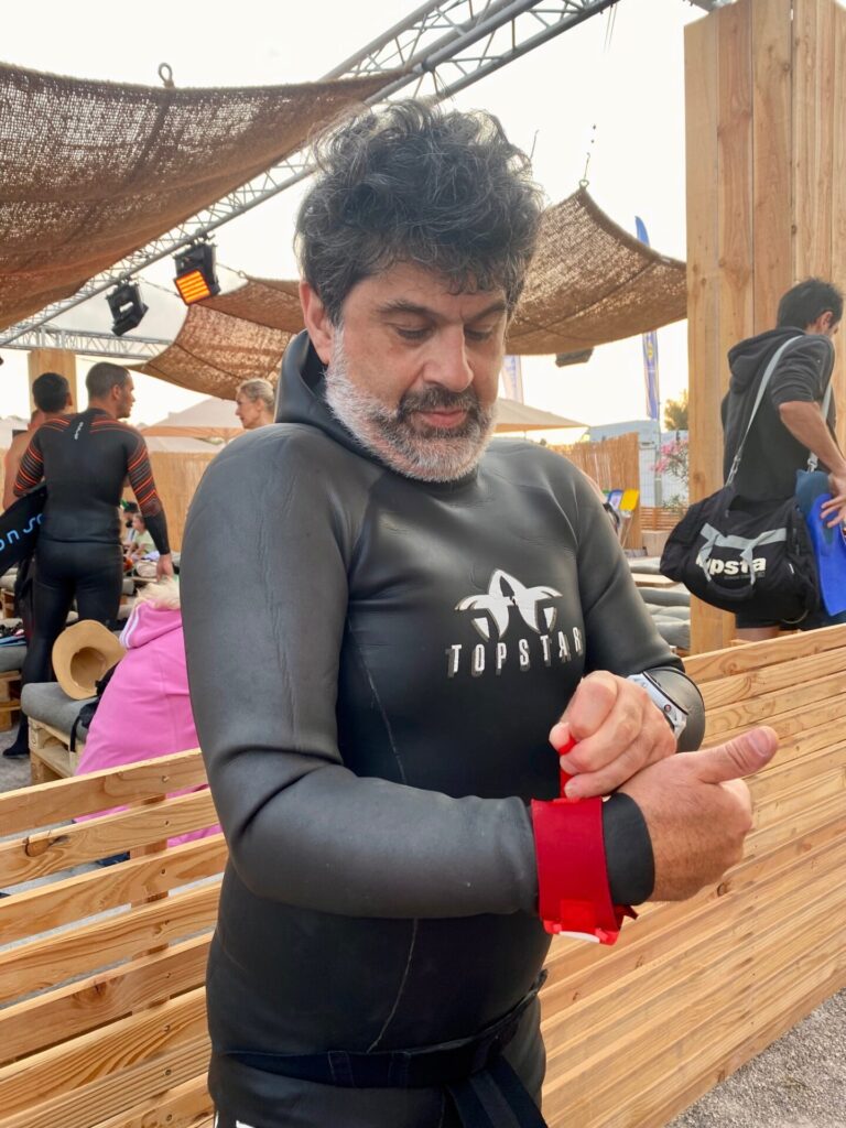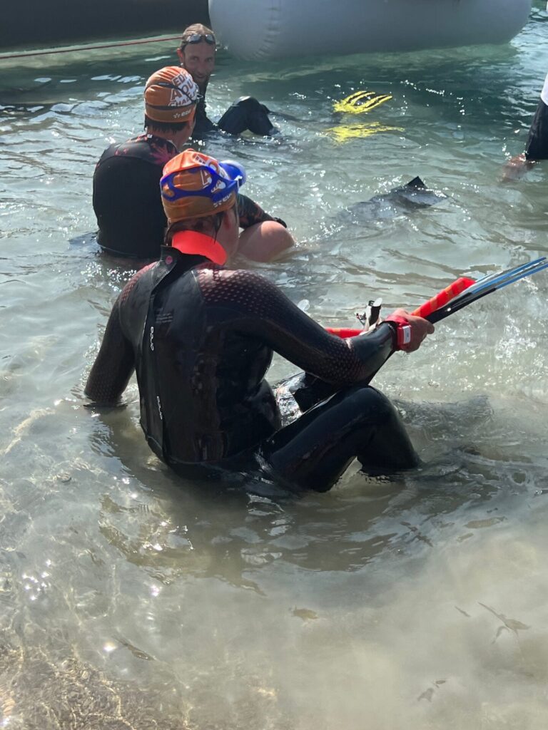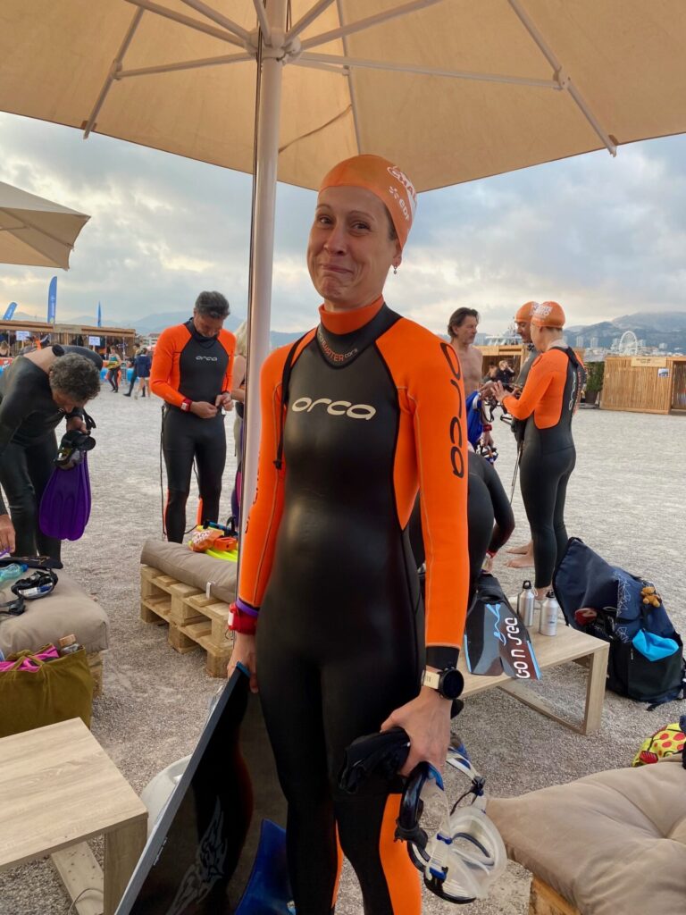 Non inscrite à cette épreuve, elle va prendre le départ et revenir sur la plage après 500 m de nage, tout cela, pour essayer son nouveau matériel …